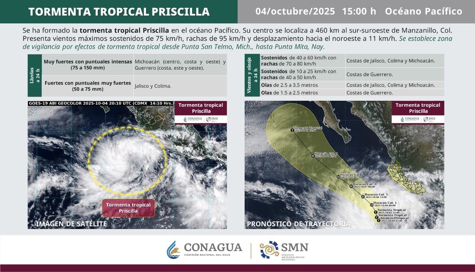 Se forma la tormenta tropical “Priscilla” en el Pacífico; provocará lluvias intensas en Guerrero