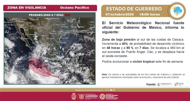 El gobierno del estado emitió una alerta preventiva ante la presencia de una zona de baja presión que se ubica al sur de las costas de Oaxaca, la cual presenta un 40 por ciento de probabilidad de convertirse en ciclón…